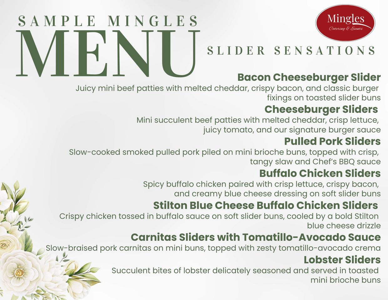 Our sliders are more than just "mini burgers"—they are curated, hand-crafted bites designed for social ease and maximum flavor. Designed as the ultimate "mix and mingle" food, our sliders are easy to handle, allowing guests to stay mobile and keep the conversation flowing.